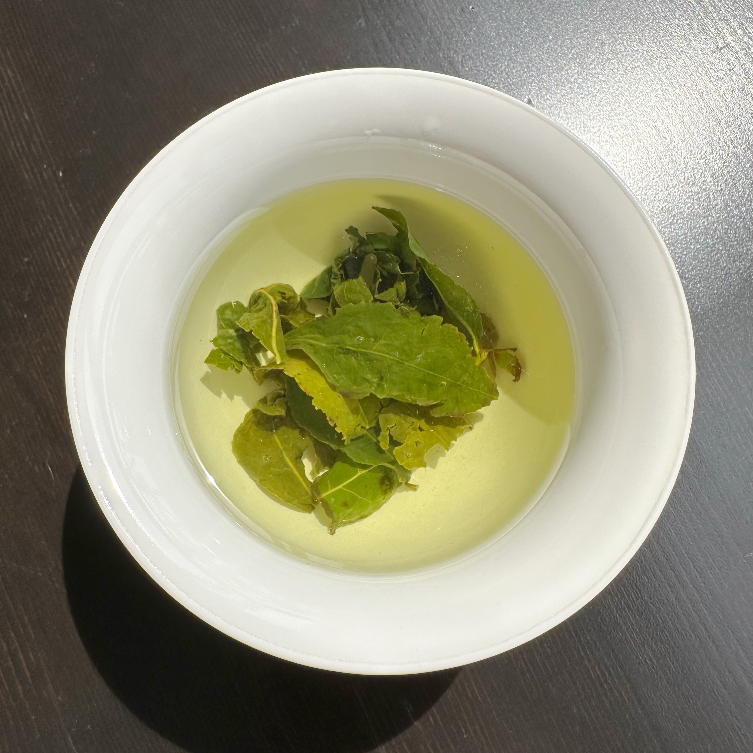 新采下來(lái)的茶有一種濃郁的香。茶農(nóng)將采下來(lái)的新葉翻曬、揉捻,再用小火慢慢烘烤。如此反復(fù),直到葉片卷曲變緊實(shí)。這樣一來(lái),茶葉的清香便被封存在葉片之中。直到把細(xì)長(zhǎng)、柔嫩的茶葉放入熱水中,我恍然大悟——原來(lái)“眉”是指茶葉形狀細(xì)長(zhǎng)如眉的意思,實(shí)在是妙。